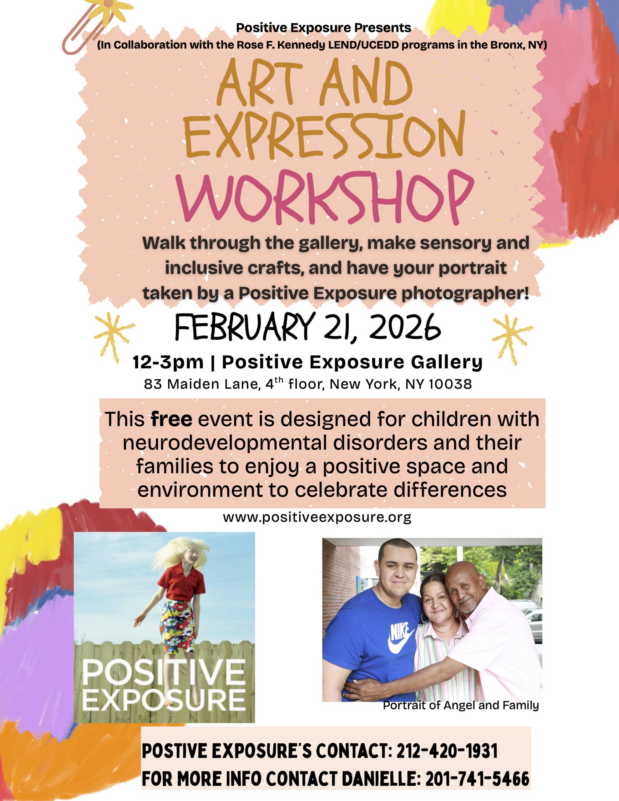 Image Description: On a colorful background featuring the PE logo and a portrait of three individuals is the following text: Positive Exposure Presents (In Collaboration with the Rose F. Kennedy LEND/UCEDD programs in the Bronx, NY): ART AND EXPRESSION WORKSHOP. Walk through the gallery, make sensory and inclusive crafts, and have your portrait taken by a Positive Exposure photographer! FEBRUARY 21, 2026. 12-3pm | Positive Exposure Gallery. 83 Maiden Lane, 4th floor, New York, NY 10038. This free event is designed for children with neuro-developmental disorders and their families to enjoy a positive space and environment to celebrate differences. POSTIVE EXPOSURE’S CONTACT: 212-420-1931. FOR MORE INFO CONTACT DANIELLE: 201-741-5466.”