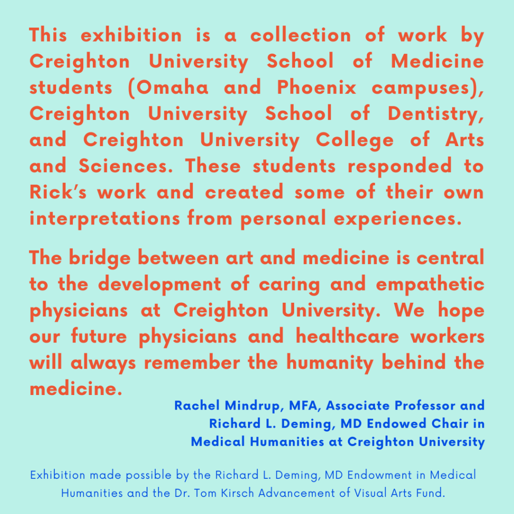 The students at Creighton University responded to Rick’s work and created some of their own interpretations from personal experiences. This exhibition is a collection of work by Creighton University School of Medicine students (Omaha and Phoenix campuses), Creighton University School of Dentistry and Creighton University College of Arts and Sciences. The bridge between art and medicine is central to the theme of the exhibition and central to the development of caring and empathetic physicians at Creighton University. We hope our future physicians and healthcare workers will always remember the humanity behind the medicine.