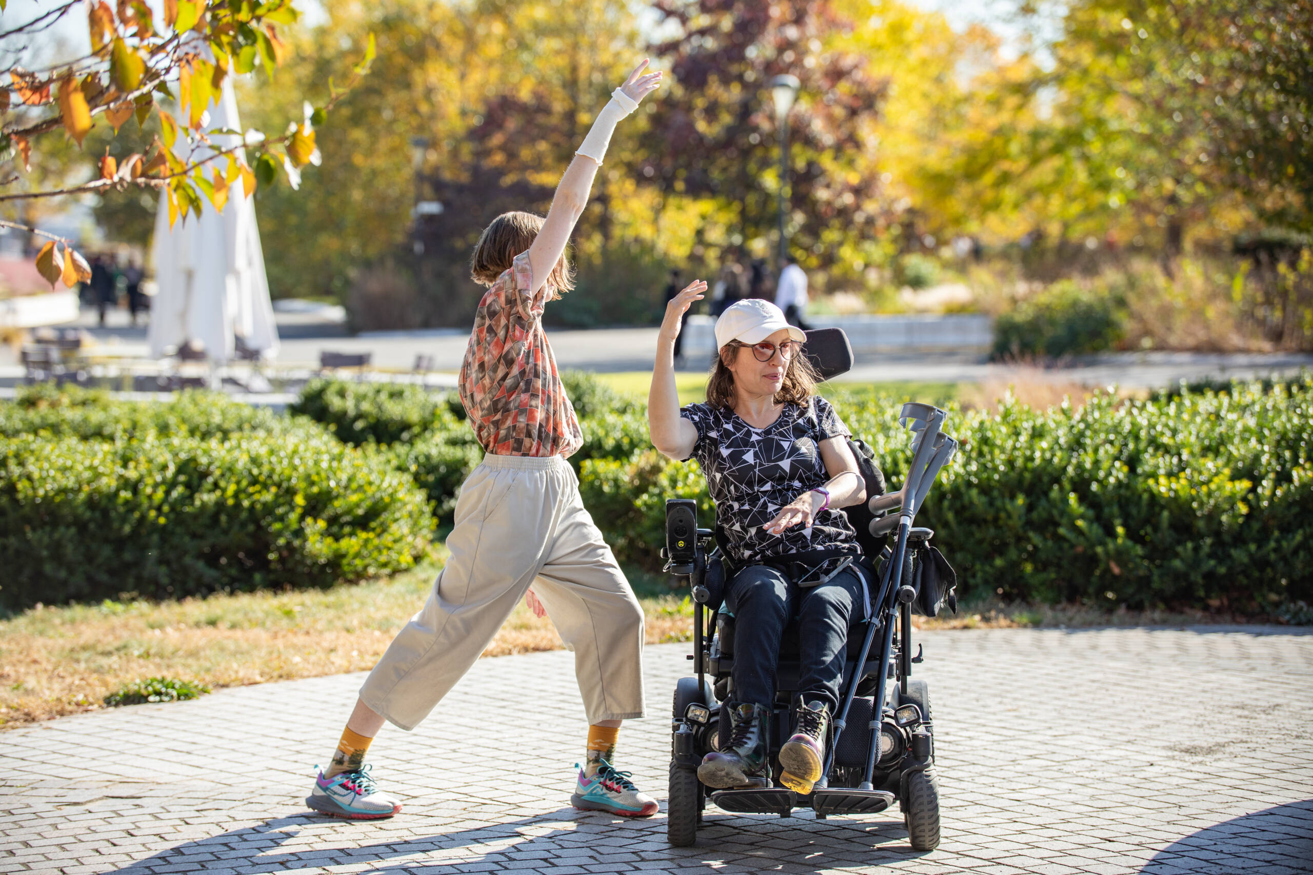 2. Kiera and Michelle dance outside together in the autumn sunlight on a patch of pavement surrounded by green shrubs and golden and red trees. They are both extending their right arms upward with a slight curve, tuning into each other’s movement. Kiera is standing with one leg bent and the other extended behind their body while facing Michelle, and Michelle is sitting in a power chair with one leg slightly extended and one more bent while facing other dancers out of frame, Doc Martens glistening in the sun.