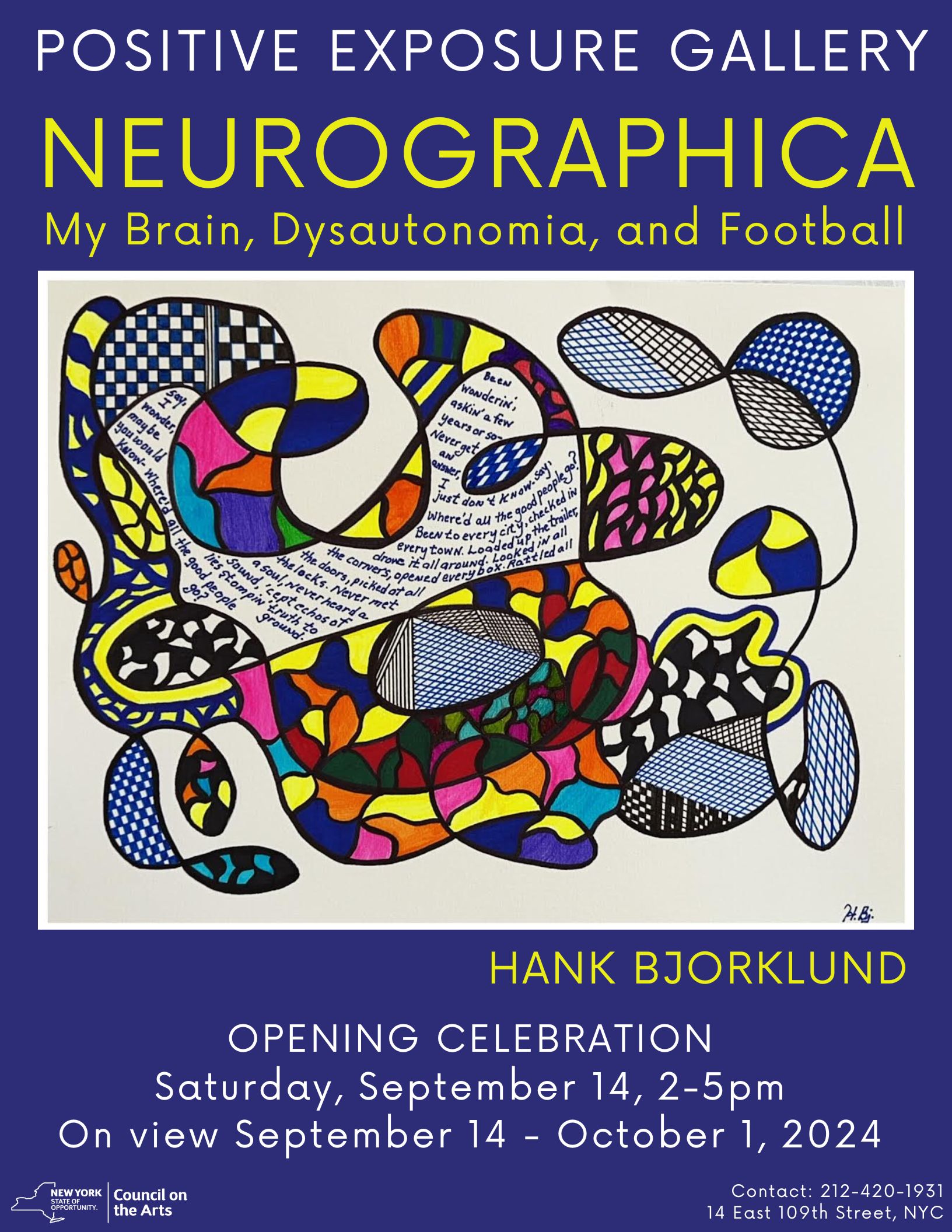 Please join us on Saturday, September 14 from 2-5pm for the opening celebration of NEUROGRAPHICA, a collection of drawings and poems by Hank Bjorklund: former New York Jet, lawyer, educator, and now poet, singer, and artist. Presentation and Q&A at 3pm.