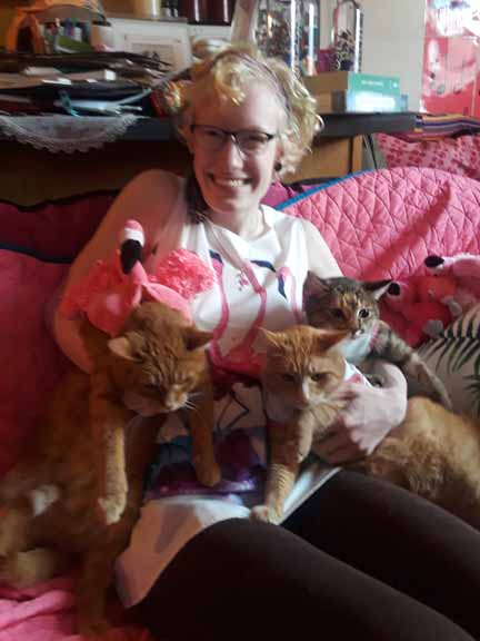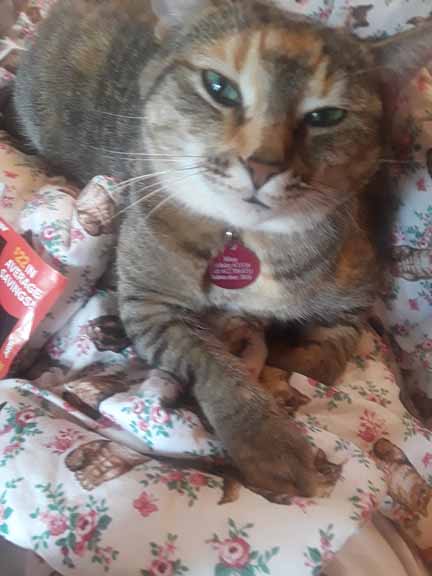 Missy is 3 and is very caring and brave. Even though she and Buttercup don’t get along (well, Buttercup doesn’t get along with any kitties), she reached out to Scrawny and licks her to make sure she’s clean. She also plays with Scrawny and gets concerned if I cry or am in pain. She is very curious about my bubble bath time and snuggles with me a little bit– so I feel especially honored when she does.