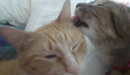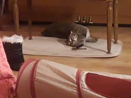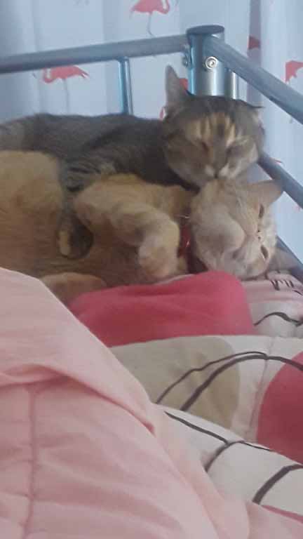Scrawny is 2 and thinks she’s a kitten and is friendly to everyone. She’s not super snuggly except in the morning before I feed her, but she’s never in a bad mood. As soon as you touch her, she purrs. She’ll play with almost anything and runs to the door with Missy when she hears my key.