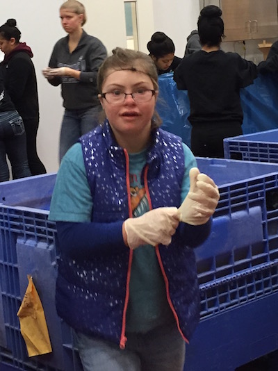 We went to work at a food bank on Saturday. I had to wear gloves and a hair net. I didn’t like it. Mom said – it is like a hat and you like hats but I said yuck! Work was okay. I was happy to see my friend Hannah.