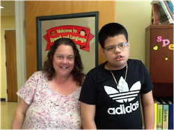 I had a 3 minute seizure on Monday. I take medication two times a day for seizures, but I still have them about once a month. Before I have a seizure, my eyes start to hurt, I feel dizzy, and my body tingles. When I woke up, my teacher, my principal, my nurse, and my aide, were all around me telling me I was ok. I don’t remember anything. I went home on Monday. Sometimes, I can start school work again, but this time I went home to rest. Here is a picture of me and my aide, Ms. Lori Morris.