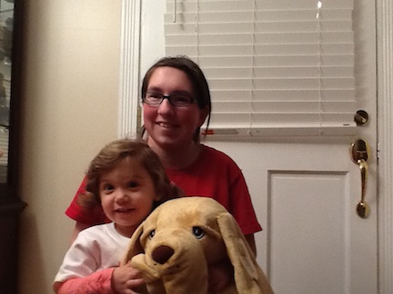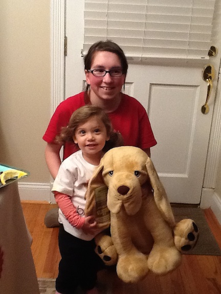 My second cousin Lucy is holding her stuffed dog I gave her. I love my second cousin Lucy.
