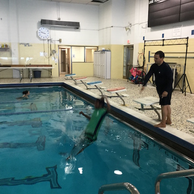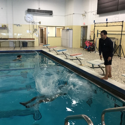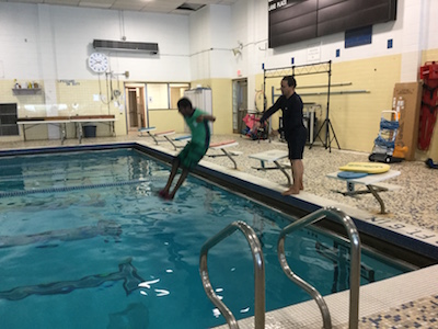 I am at the YMCA . Esther came to see me Jump from the big pool.